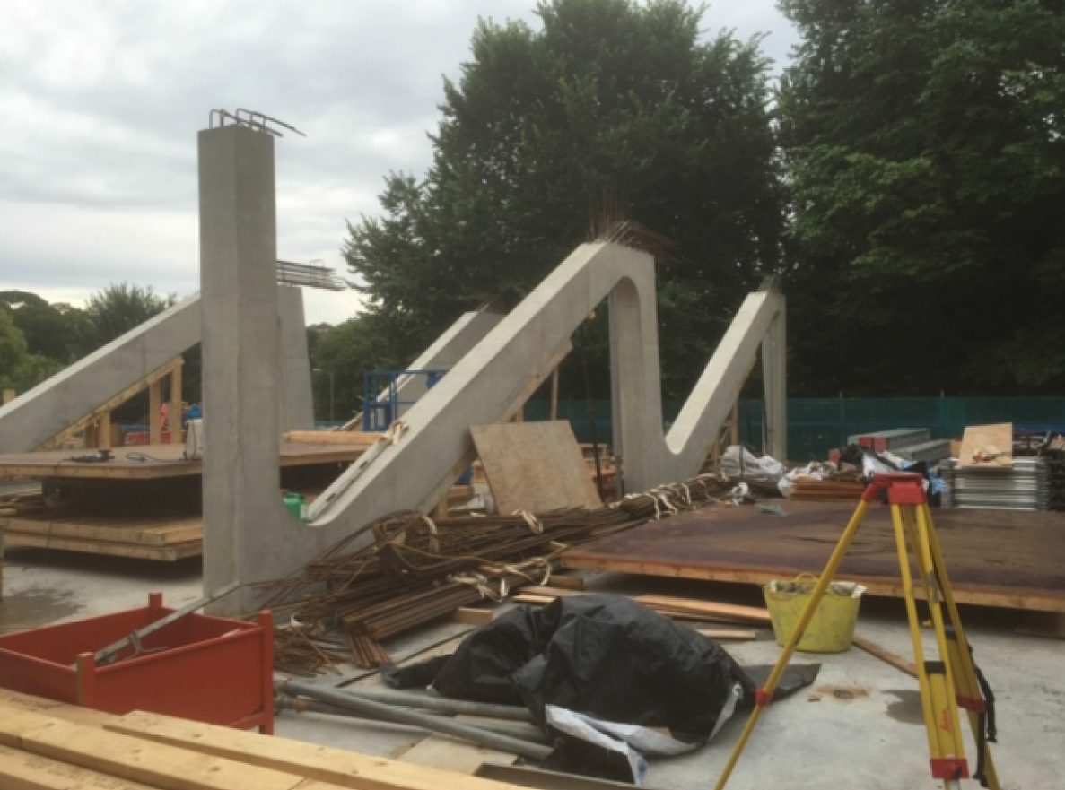For the University of Brighton, we created a cantilevered first-floor level projecting well out over the ground floor level. To construct this we had to form the first floor, concrete it and keep it propped with temporary props until the structure above it was completed up to and including the roof level.