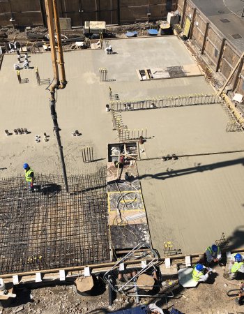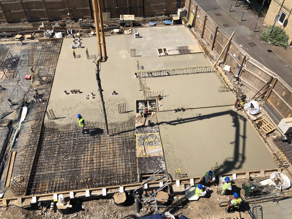 Our work will include: Site Remediation. Groundworks and Reinforced Concrete Frame extending to Fourth Floor plus roof and overruns. The image shows the ground floor slab being concreted.